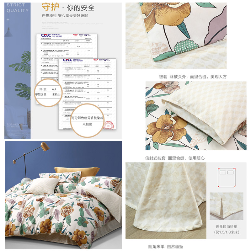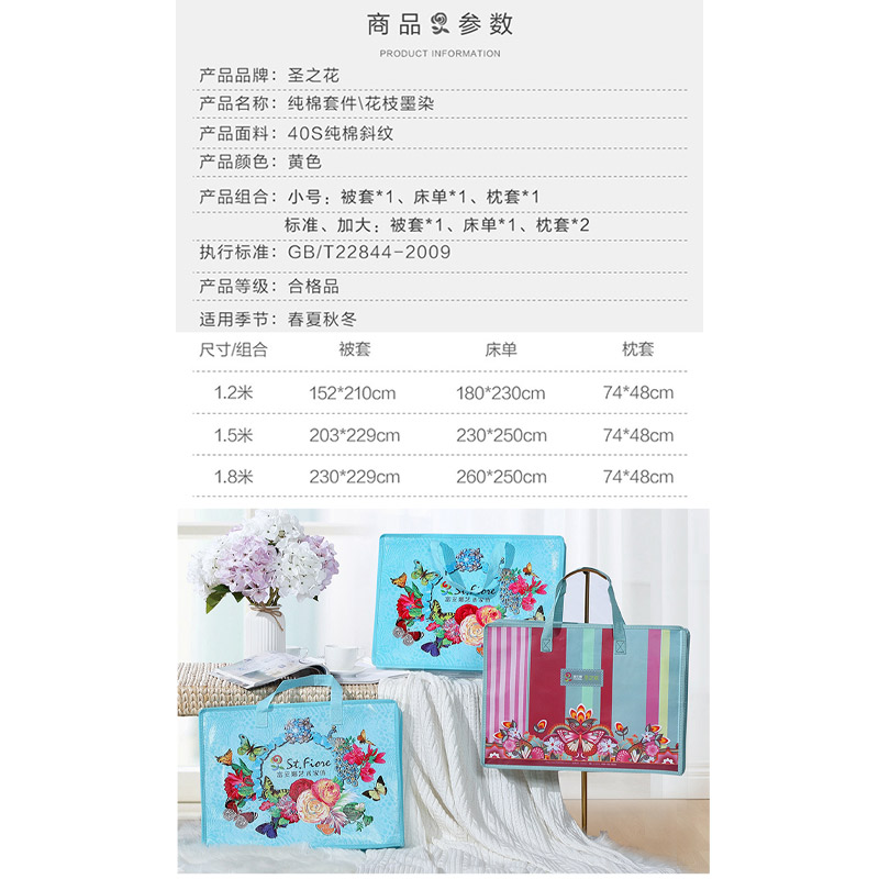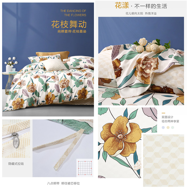 花枝墨染 床单三件套(被套1件床单1件枕套1件)(适合1.2米床)【纯棉/黄】