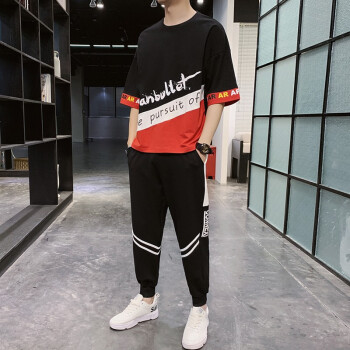 班迪普【运费险】卫衣套装T恤男运动服短袖男装春夏新款透气韩版休闲潮牌中青少年大码胖子工装长裤子男 黑色 L/建议120-135斤 |