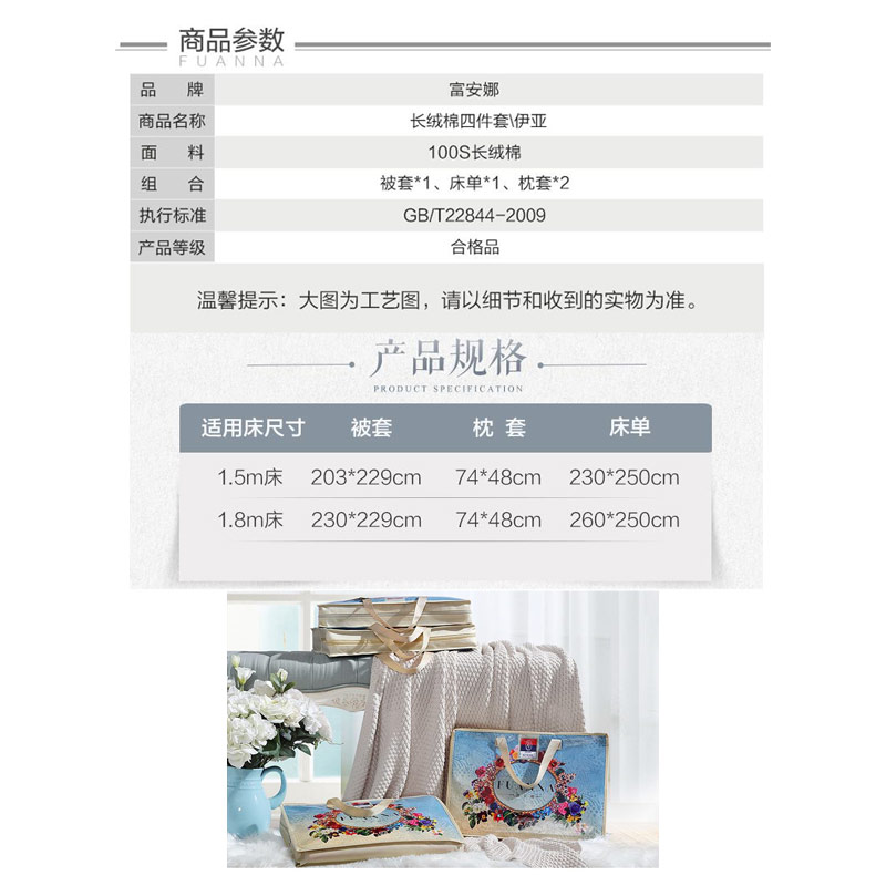 伊亚 床单四件套(被套1件床单1件枕套2件)(适合1.5米床)【100支长绒棉/蓝】