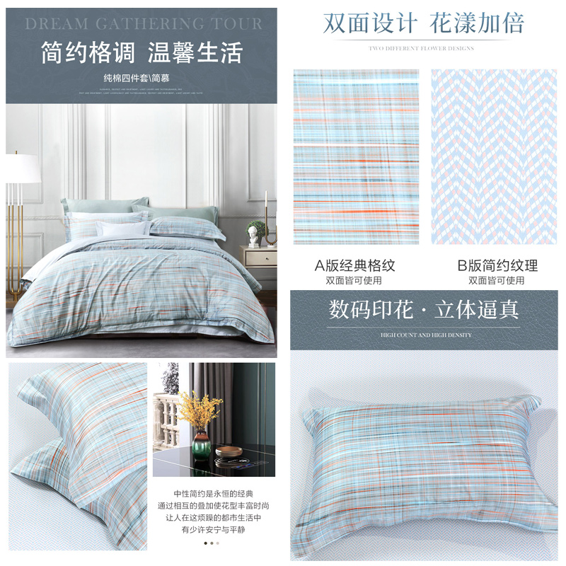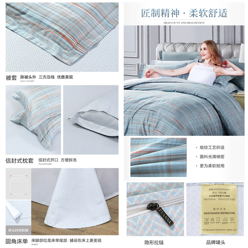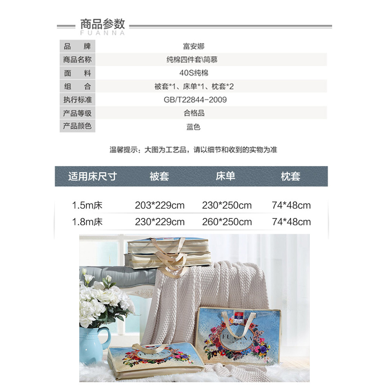 简慕 床单四件套(被套1件床单1件枕套2件)(适合1.8米床)【纯棉缎纹/蓝】