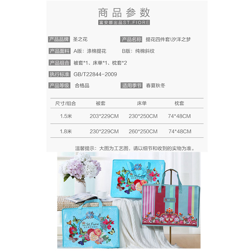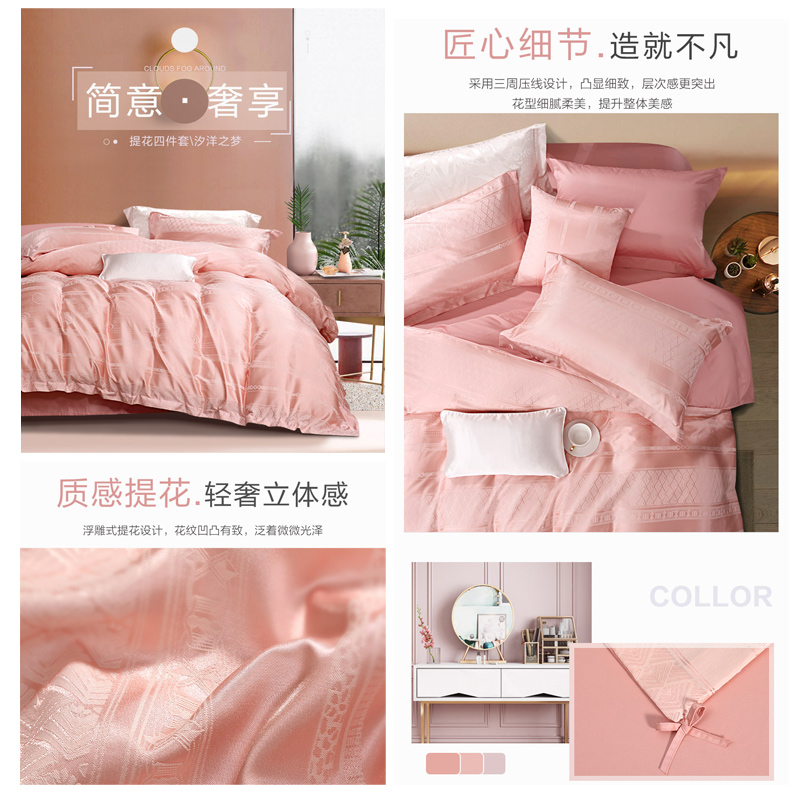 床上套件>>汐洋之梦 床单四件套(被套1件床单1件枕芯2件)(适合1.8米床)【A版:涤棉提花;B版:纯棉/粉】