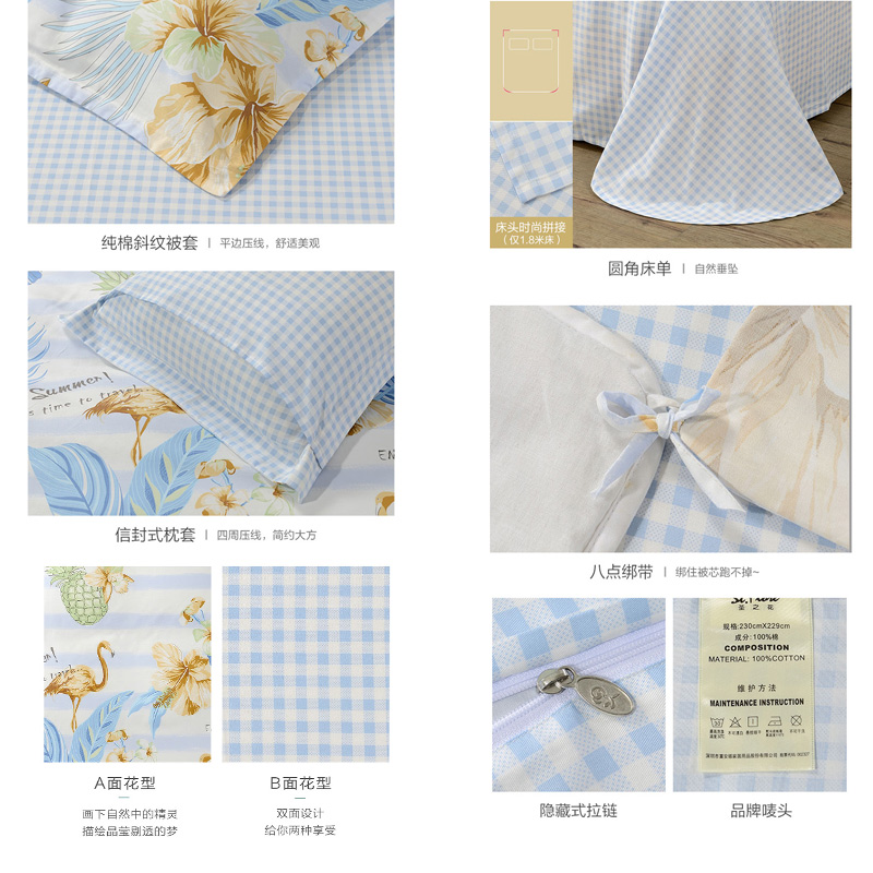 丛林夏梦 床单四件套(被套1件床单1件枕套2件)(适合1.5米床)【纯棉/蓝】