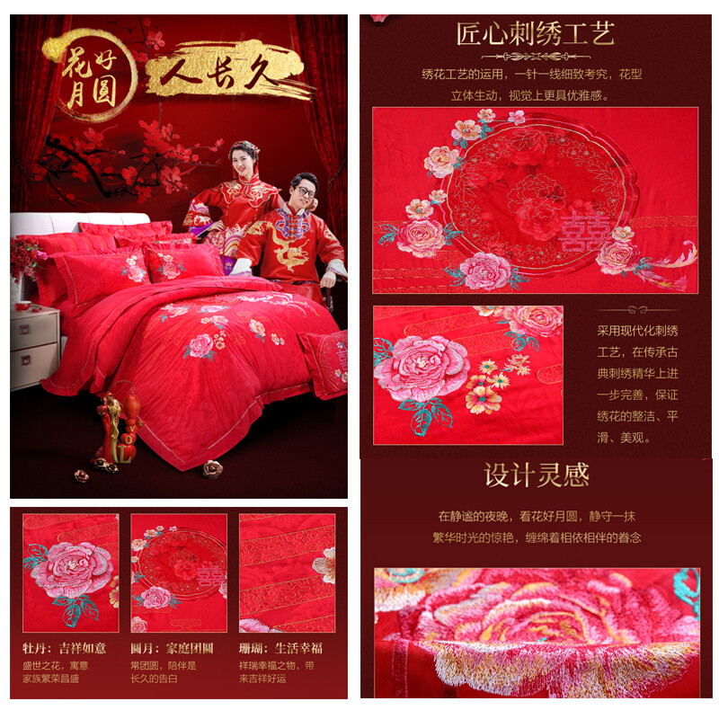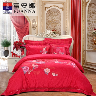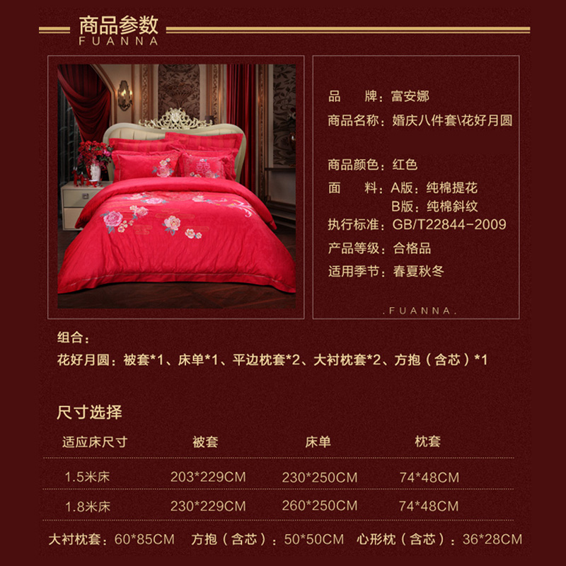 花好月圆 床单八件套(被套1件床单1件枕套4件方抱芯1件方抱套1件)(适合1.5米床)【纯棉提花/红】