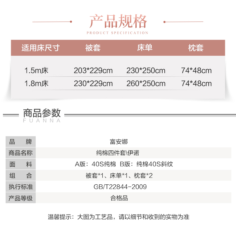 伊诺 纯棉床单四件套(被套1件床单1件枕套2件)(适合1.8米床)【40支纯棉/粉】