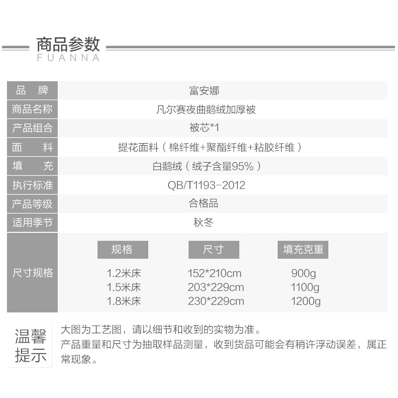 凡尔赛夜曲鹅绒加厚被(被芯1件)(适合1.5米床)【面料:涤竹棉提花;填充:95%白鹅绒/灰】