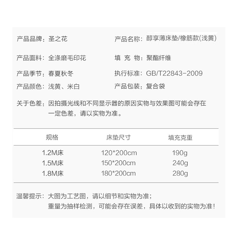 醇享薄床垫 橡筋款(床垫1件)(适合1.5米床)【面料:聚酯纤维;填充:聚酯纤维/浅黄】