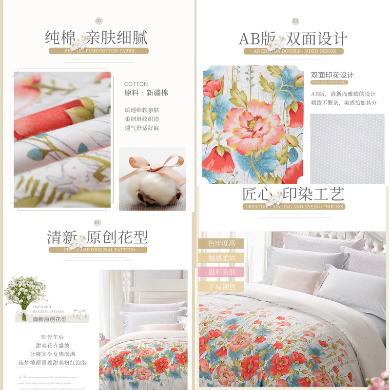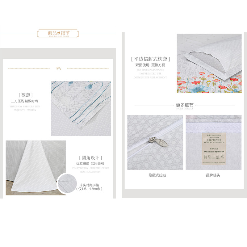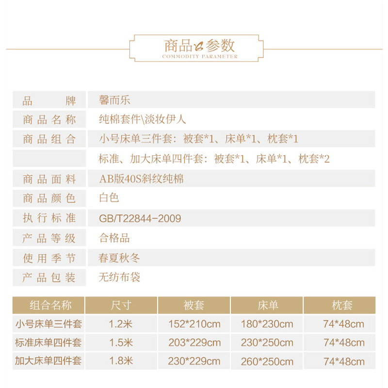 淡妆伊人 床单三件套(被套1件床单1件枕套1件)(适合1.2米床)【40支纯棉/白】