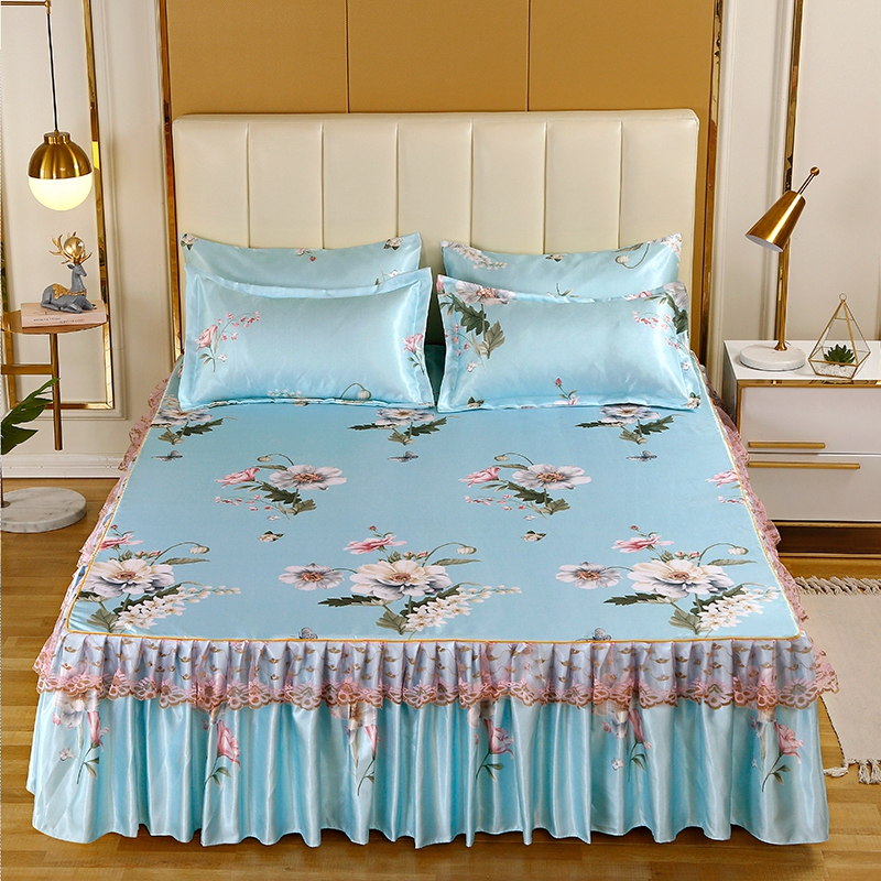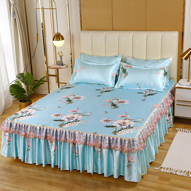 印花蕾丝床裙款冰丝席凉席三件套【冰丝(聚酯纤维)/花叶情深-兰】