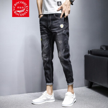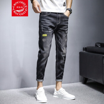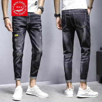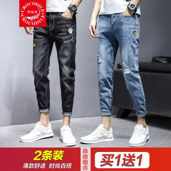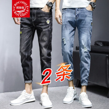 牛仔裤>>【两条装】鳄鱼恤牛仔裤男夏季新款裤子男韩版潮流小脚九分裤男士宽松休闲裤男时尚百搭破洞牛仔裤男修身男裤 981黑色+897蓝色 31