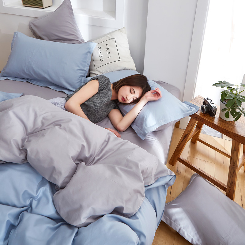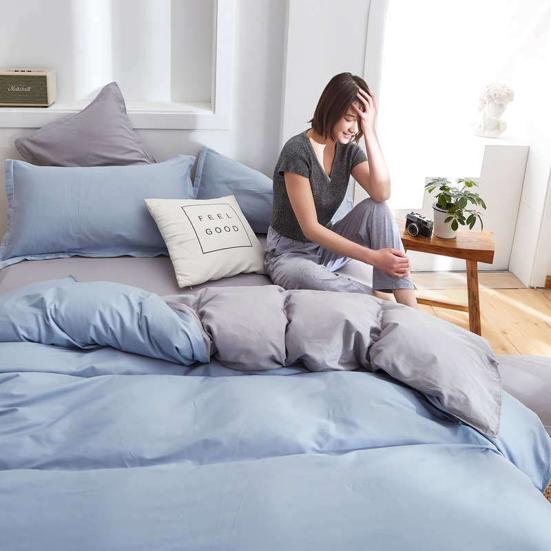 极简时尚双拼全棉喷气四件套【全棉/蓝灰+浅灰】