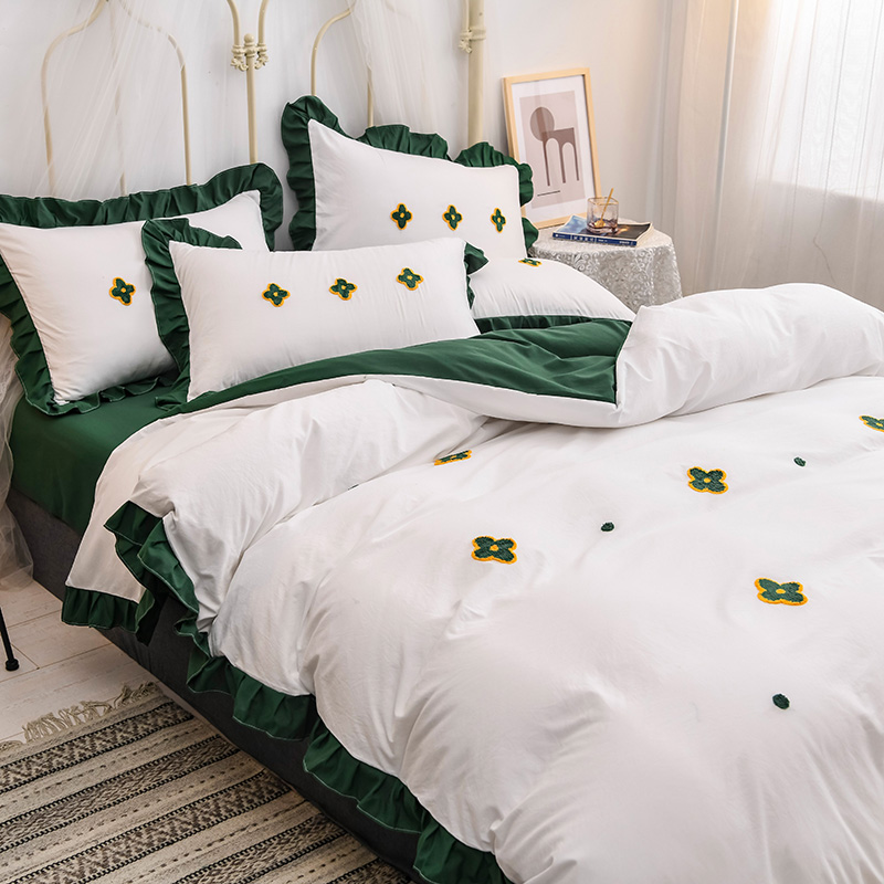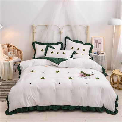 【锦软贴身】泫雅花毛巾绣荷叶边四件套【聚酯纤维/四叶草-白绿】