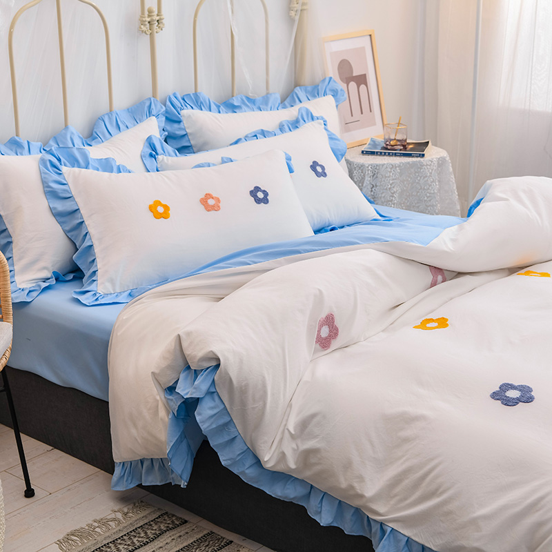 【锦软贴身】泫雅花毛巾绣荷叶边四件套【聚酯纤维/泫雅花-白蓝】