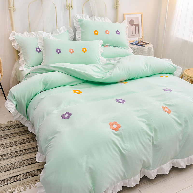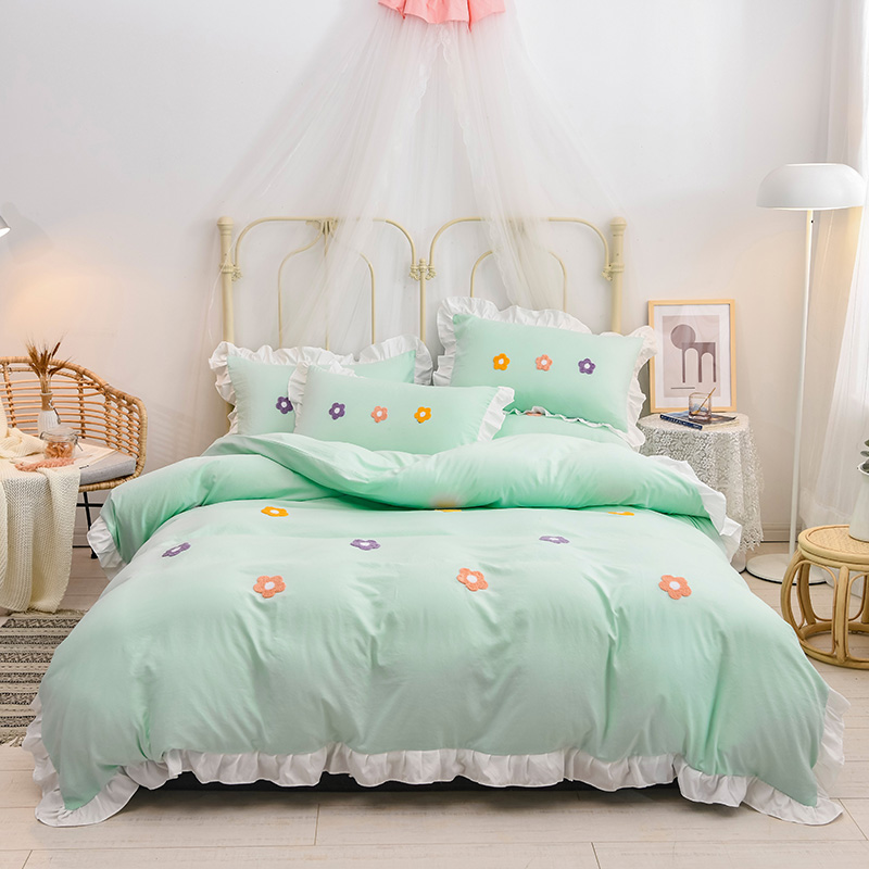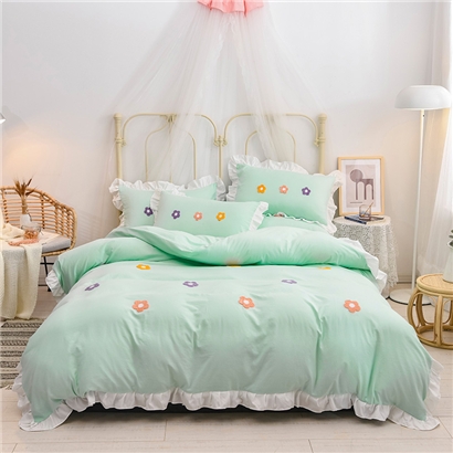 【锦软贴身】泫雅花毛巾绣荷叶边四件套【聚酯纤维/泫雅花-水绿】
