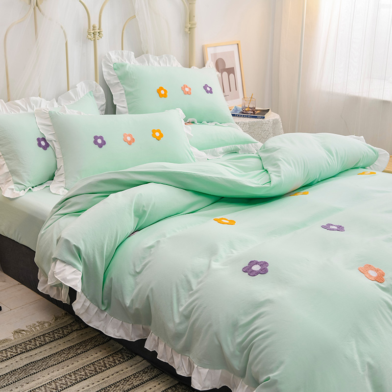 【锦软贴身】泫雅花毛巾绣荷叶边四件套【聚酯纤维/泫雅花-水绿】