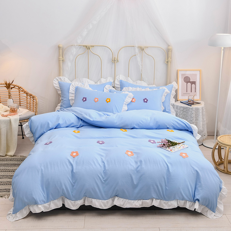 【锦软贴身】泫雅花毛巾绣荷叶边四件套【聚酯纤维/泫雅花-蓝】