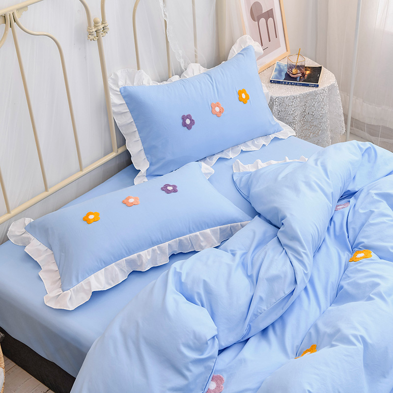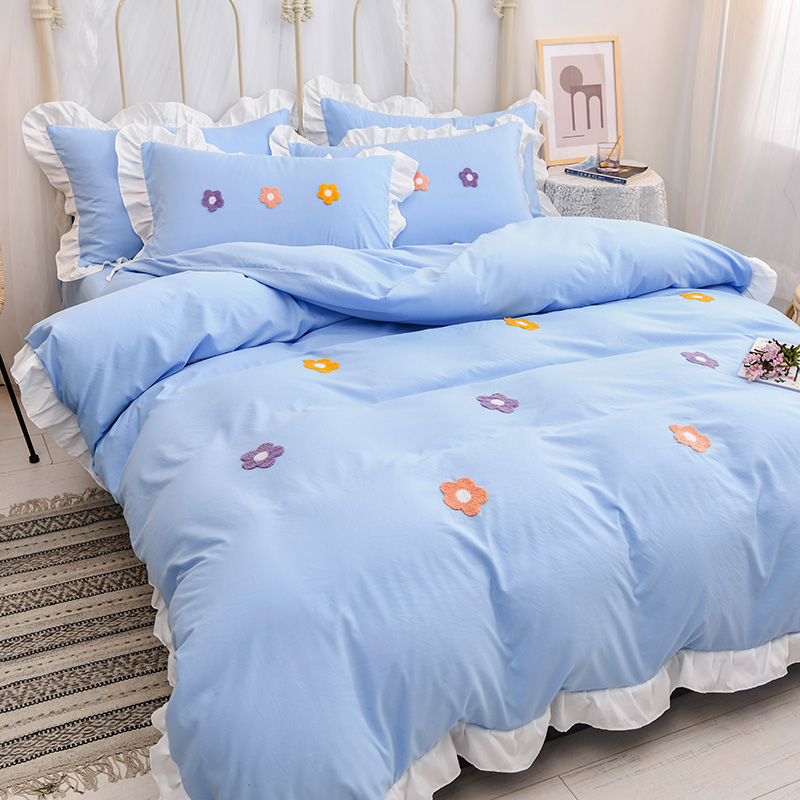 【锦软贴身】泫雅花毛巾绣荷叶边四件套【聚酯纤维/泫雅花-蓝】
