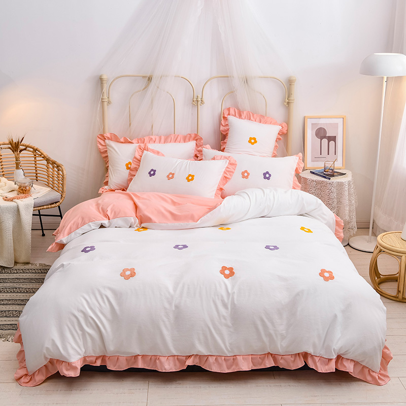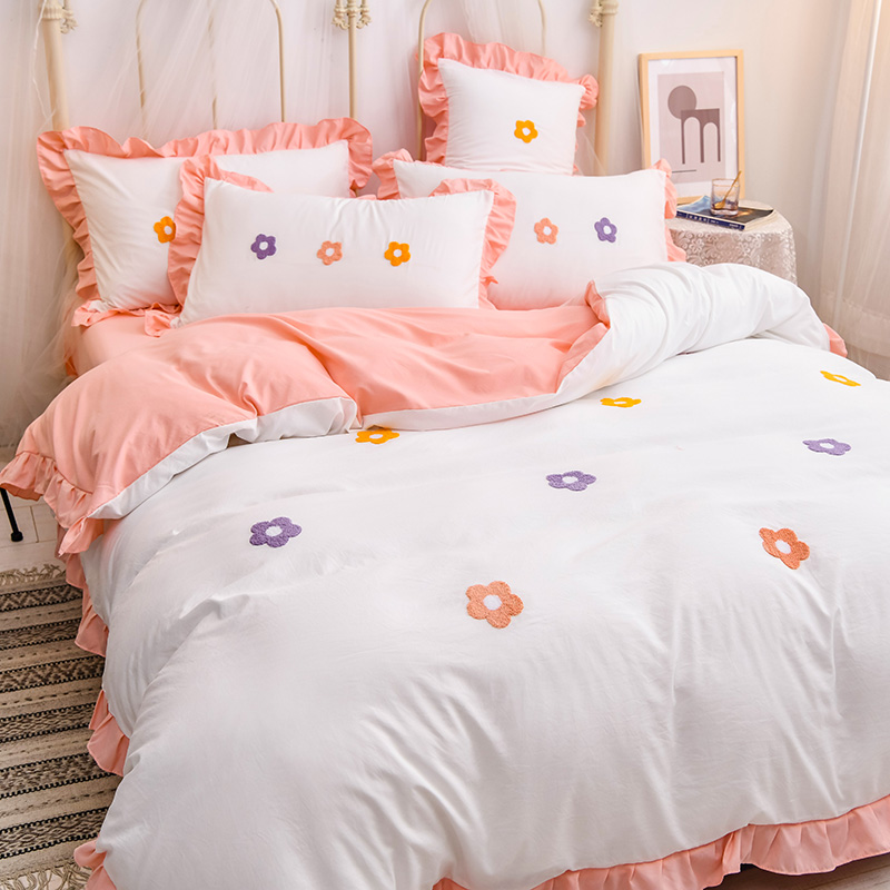 【锦软贴身】泫雅花毛巾绣荷叶边四件套【聚酯纤维/泫雅花-白玉】