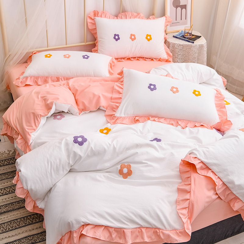 【锦软贴身】泫雅花毛巾绣荷叶边四件套【聚酯纤维/泫雅花-白玉】