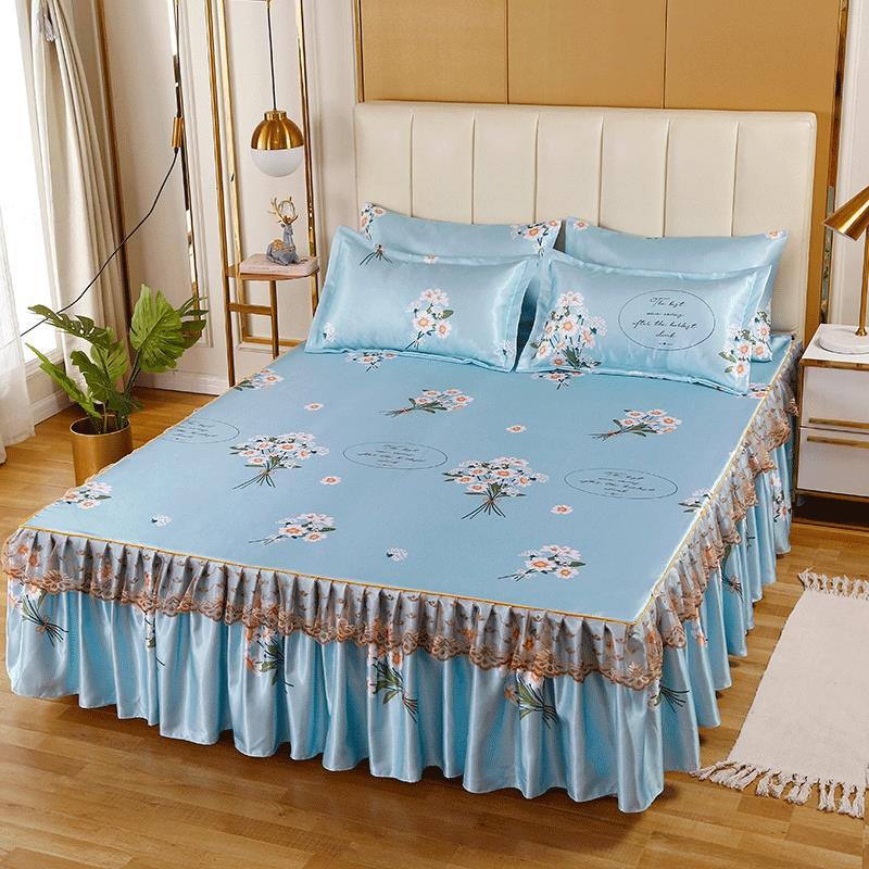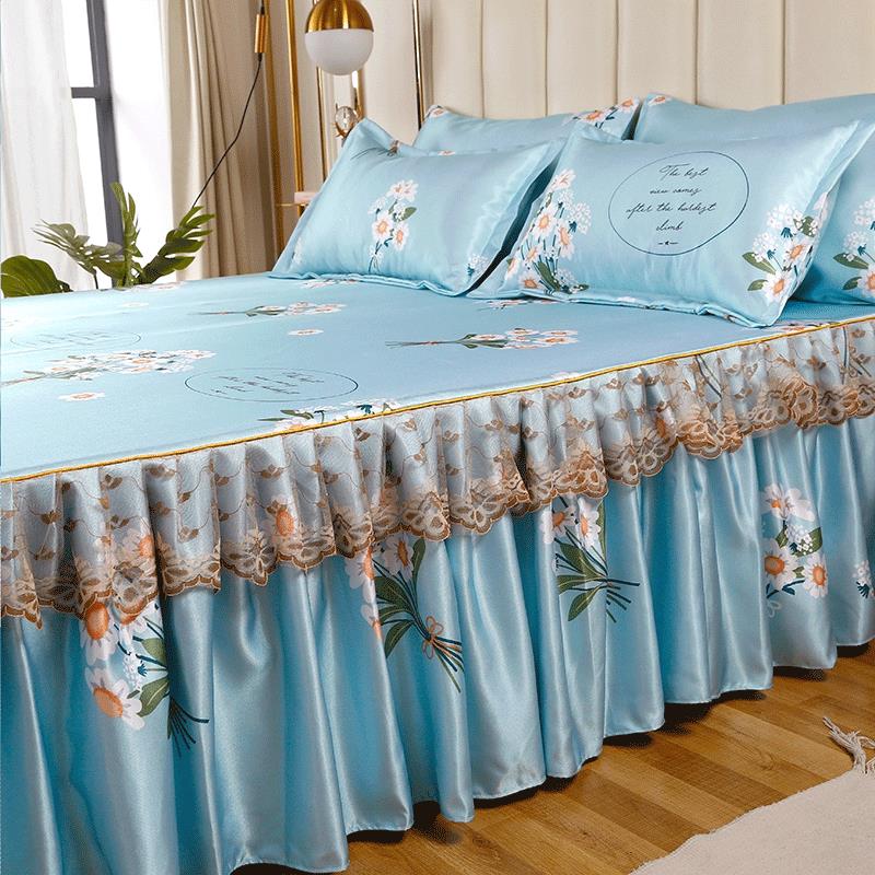 印花蕾丝床裙款冰丝席凉席三件套【冰丝(聚酯纤维)/朵菲雅-兰】