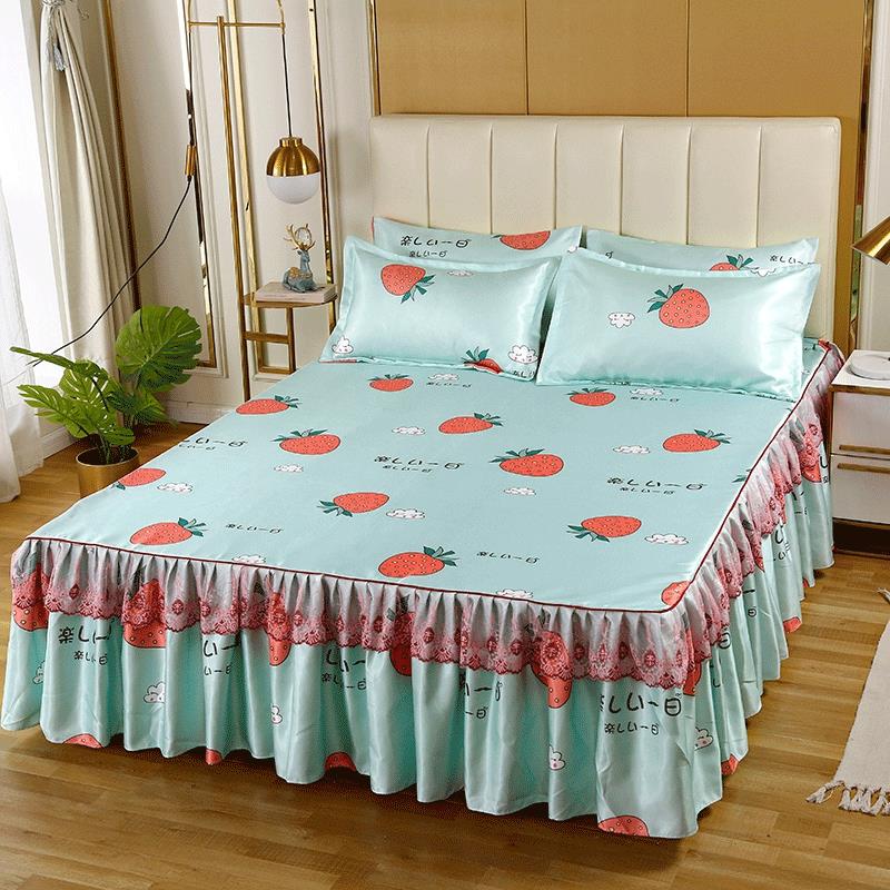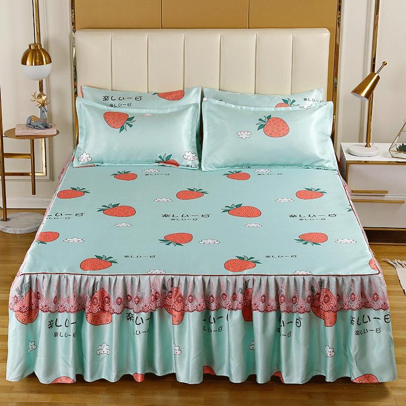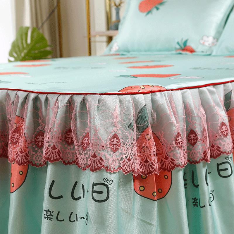 印花蕾丝床裙款冰丝席凉席三件套【冰丝(聚酯纤维)/草莓心语】