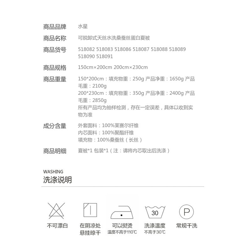 可脱卸式天丝水洗桑蚕丝蛋白夏被(夏被*1)【外套面料:莱赛尔纤维 填充物:桑蚕丝(长丝)/(恩莎)】