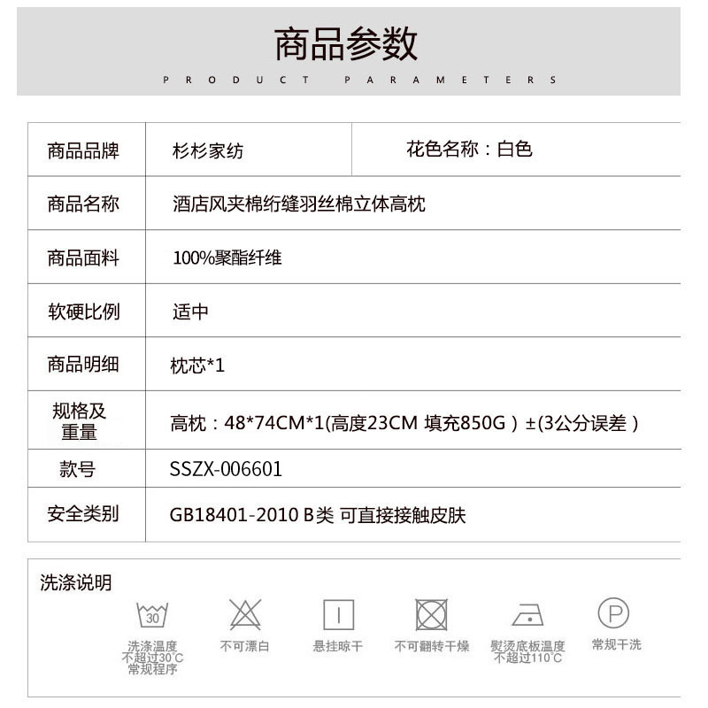 酒店风夹棉绗缝羽丝棉立体高枕【面料:聚酯纤维 填充:羽丝绒(100%聚酯纤维)/白色】