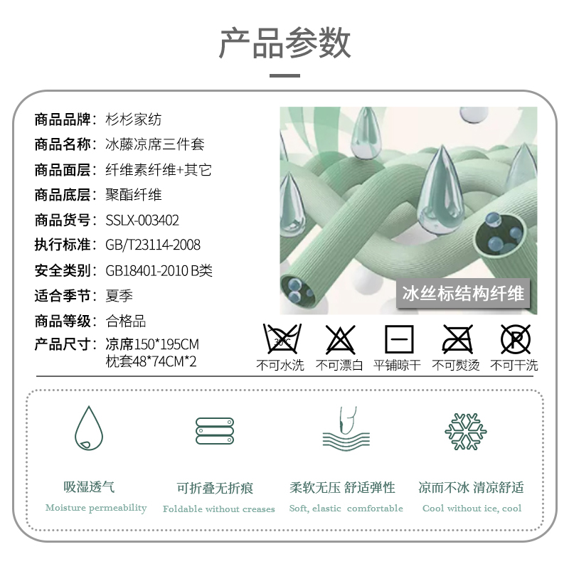 透气冰藤席三件套【面层:纤维素纤维+其他底层:聚酯纤维/颜色自选】