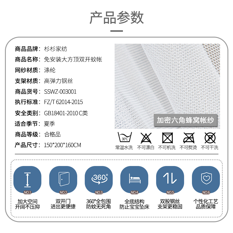 免安装大方顶双开蚊帐【支架材料:高弹力钢丝网纱材质:涤纶/颜色自选】