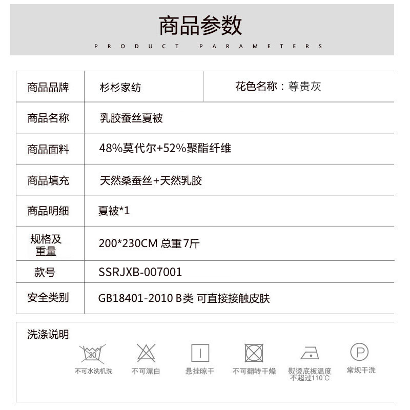 乳胶蚕丝夏被【面料:48%莫代尔52%聚酯纤维填充:天然桑蚕丝+天然乳胶/尊贵灰】