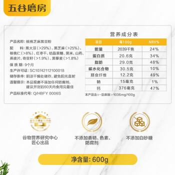 五谷磨房早餐 核桃芝麻黑豆粉奇亚籽黑藜麦五谷杂粮代餐粉黑芝麻糊黑芝麻粉600g |