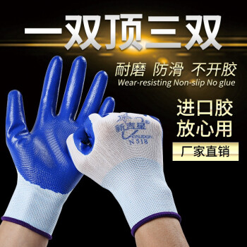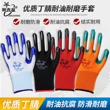 新吉星N518丁腈手套 浸胶涂胶乳胶劳保手套 防滑耐磨透气耐油耐酸碱工地工作干活防护手套N518 (进口胶)新吉星白纱蓝色【12双】