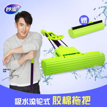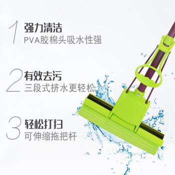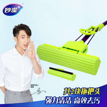 妙洁海绵拖把 家用办公室吸水墩布懒人免手洗自动胶棉托地板挤水式清洁伸缩长杆工具刮水神器 共2个替换头