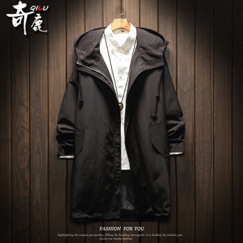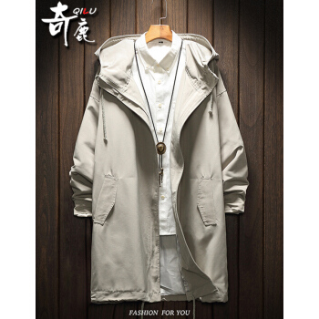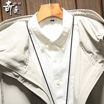 风衣>>奇鹿 春秋新款连帽工装风衣男中长款夹克男复古街头宽松冲锋衣帅气大衣韩版潮流大码加厚夹棉多口袋青年外套 卡其色(不夹棉) XL(适合145-165斤)