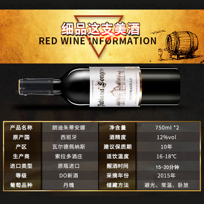 西班牙原瓶进口朗迪朱蒂安娜干红葡萄酒