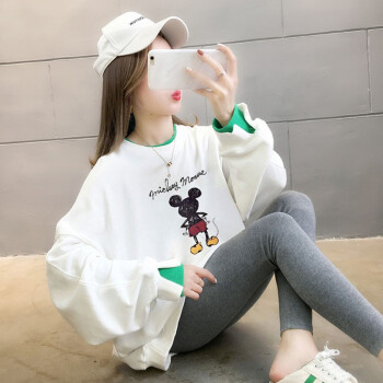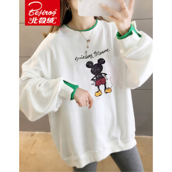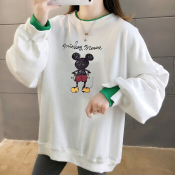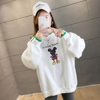 北极绒卫衣女2020春秋季新品潮流时尚卡通印花圆领卫衣女休闲宽松套头长袖假两件上衣女2505 白色 请拍正确尺码