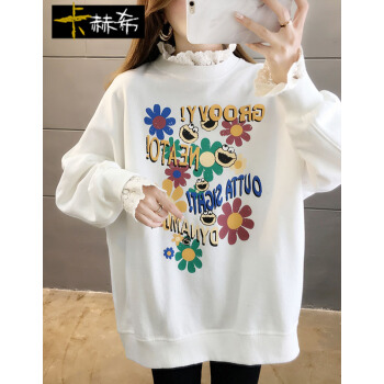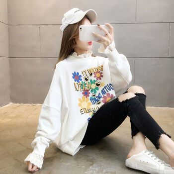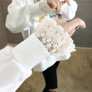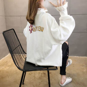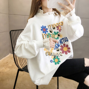 卡赫希卫衣女2020春秋季新款时尚休闲宽松韩版潮ins春秋装蕾丝百搭薄款假两件上衣女5002 白色 请拍正确尺码