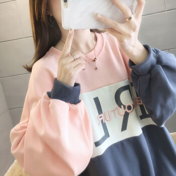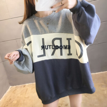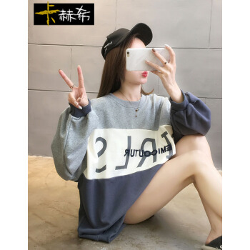 卫衣>>卡赫希卫衣女2020春秋季新款慵懒风百搭休闲学生上衣女时尚宽松圆领长袖拼接中长款女卫衣5006 灰色 请拍正确尺码