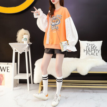 小赖猴蕾丝拼接卫衣女长袖薄外套早秋2020新款韩版宽松慵懒风上衣 橘色 均码