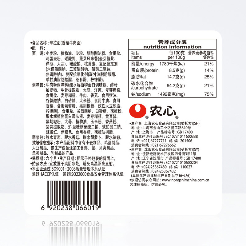 农心香菇牛肉味辛拉面方便面