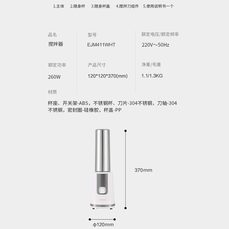 430ml按压家用便携式搅拌机随身奶昔果汁杯电动榨汁机【不锈钢/白色】