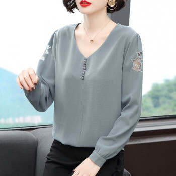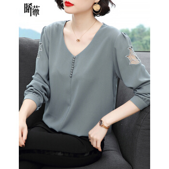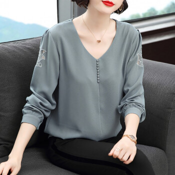 【精选好货】晞薇雪纺上衣2020新款春夏装时尚简约打底衫中年妈妈大码长袖T恤女洋气小衫遮肚宽松 浅灰蓝 请拍正确尺码 |