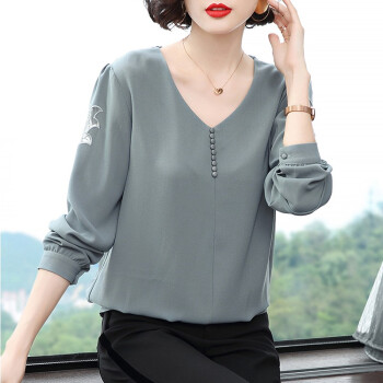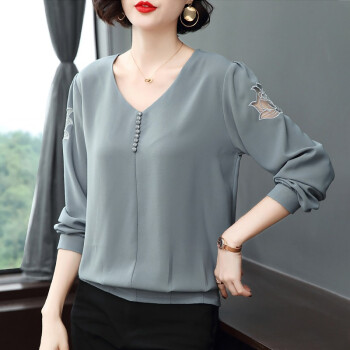 雪纺衫>>【精选好货】晞薇雪纺上衣2020新款春夏装时尚简约打底衫中年妈妈大码长袖T恤女洋气小衫遮肚宽松 浅灰蓝 请拍正确尺码
