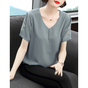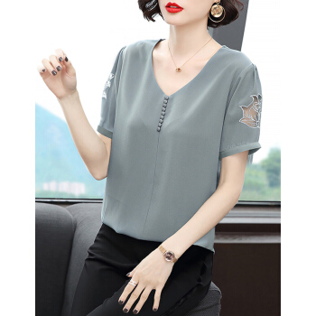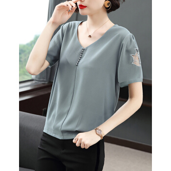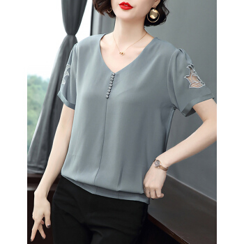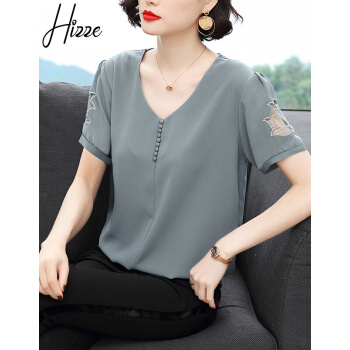 【精选好货】Hizze短袖雪纺衫女2020新款夏装时尚洋气雪纺上衣大码中年妈妈装碎花遮肚小衫T恤夏 浅灰蓝 请拍正确尺码