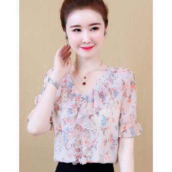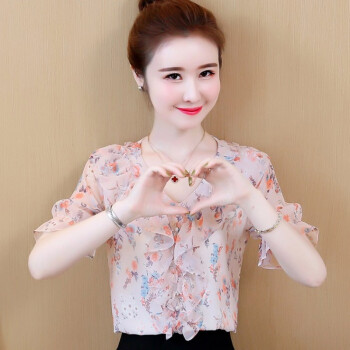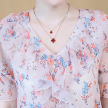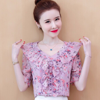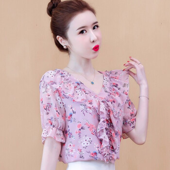 心莉美 雪纺衫女2020夏装新款v领荷叶边雪纺衬衫短显瘦洋气碎花衬衫女上衣潮 花色 L