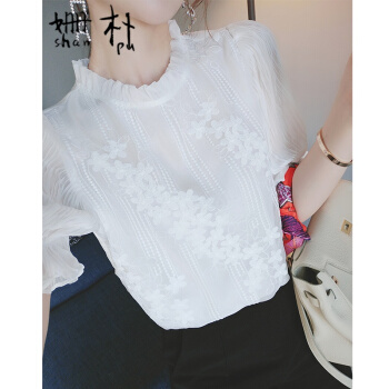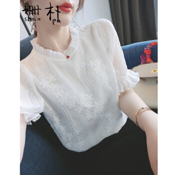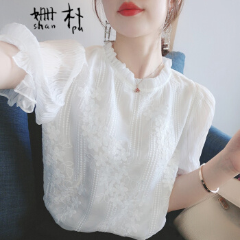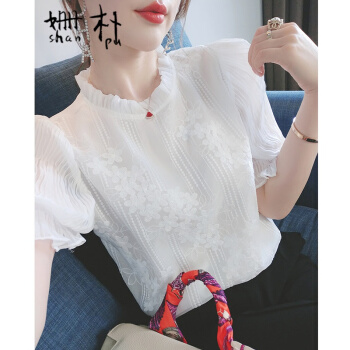 姗朴 雪纺衫女韩版2020夏季新款蕾丝刺绣衬衫女宽松显瘦洋气木耳边打底衫超仙上衣短袖立领荷叶袖蕾丝衫 白色 L