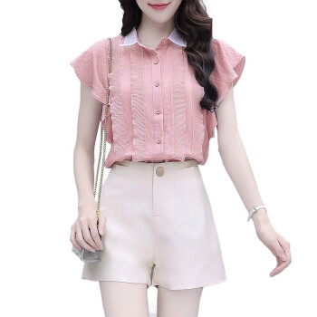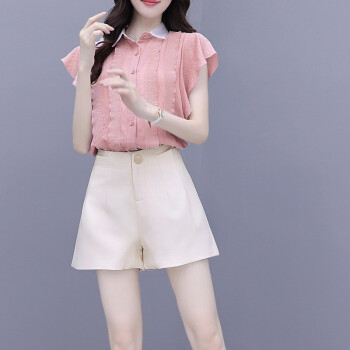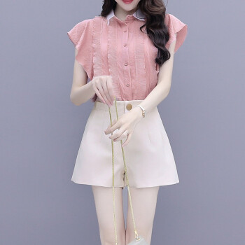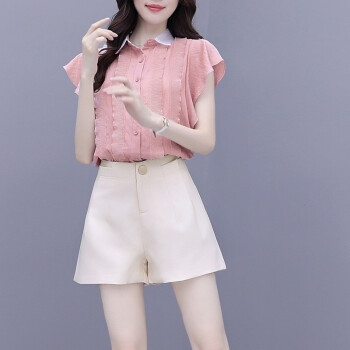 雪纺衫>>灏尼欧 雪纺衫套装女夏装新款2020年小个子显高洋气减龄休闲短裤子两件套 粉色套装 M