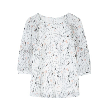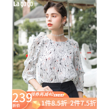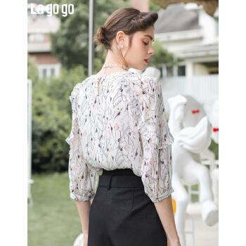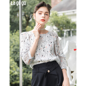 雪纺衫>>Lagogo拉谷谷2020年夏季新款圆领印花甜美七分袖修身套头上衣雪纺衫女JASS406C27 混色(Y0) 165/L/40
