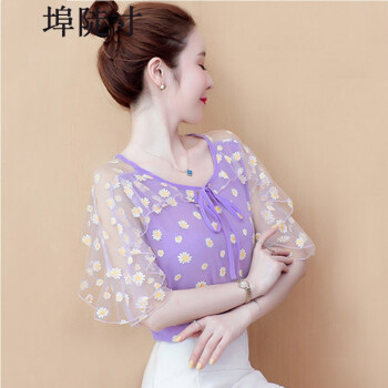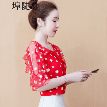 雪纺衫女埠陡寸2020夏季新品宽松显瘦蝴蝶结印花系带荷叶袖短袖上衣女 红色 S【80-95】