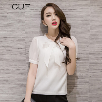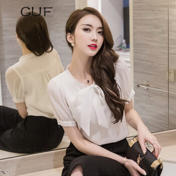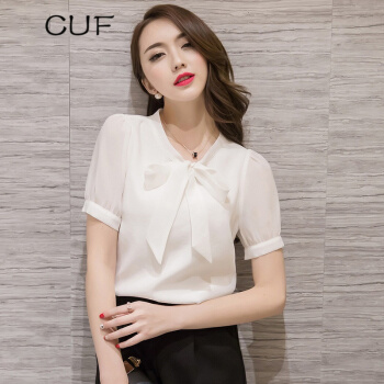 雪纺衫>>CUF 香港潮牌 雪纺衬衫女装2020年夏季新款V领蝴蝶结职业上衣纯色显瘦短袖打底衫百搭气质 白色 S