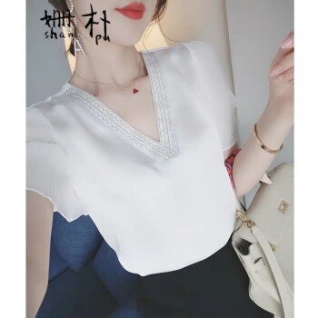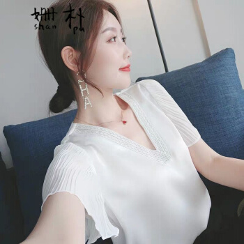 雪纺衫>>姗朴 雪纺衫女2020夏季新款大码女装印花雪纺洋气上衣宽松显瘦小衫短袖休闲时尚仙气V领港味荷叶袖衬衫 白色 L